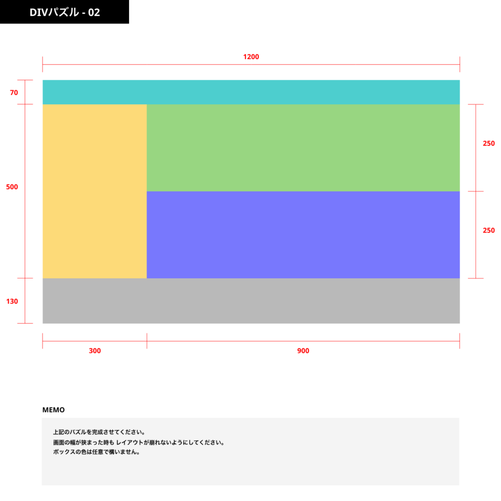 DIVパズル02 DIVパズル 2024.08.24 2022.01.28 注意事項 高さ(height)は指定しなくても良いところは指定しないようにしましょう タグの間違えに注意しましょう コンテンツ全体が画面の中央に表示されるように margin: 0 auto; などを使用してください。