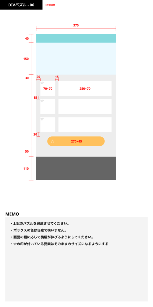 DIVパズル06 DIVパズル 2024.08.24 2022.02.16 注意事項 高さ(height)は指定しなくても良いところは指定しないようにしましょう タグの間違えに注意しましょう 375px以下になっても画面が見切れたりしないようにする 「☆」は分かりやすくするためのマークなので、コードには記載しないでください。